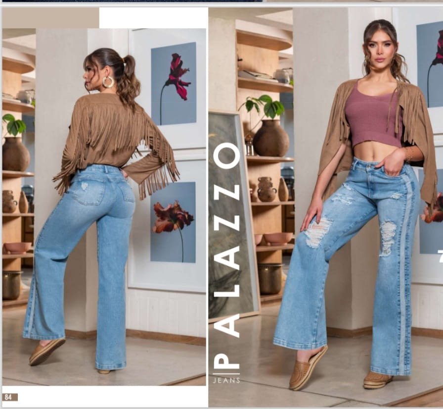 Descubre la elegancia y comodidad del pantalón palazzo 700-1694, con desgastes que le aportan un estilo moderno y único. Su diseño de un solo botón y tono claro lo hacen perfecto para cualquier ocasión, combinando versatilidad y sofisticación en una sola prenda. Ideal para destacar tu estilo con frescura y comodidad.